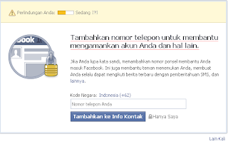"Tambahkan nomor telepon untuk membantu mengamankan akun Anda dan hal lain. Jika Anda lupa kata sandi, menambahkan nomor ponsel membantu Anda masuk Facebook. Ini juga membantu teman menemukan Anda, membuat Anda selalu dapat mengikuti berita terbaru dengan pemberitahuan SMS, dan lainnya".